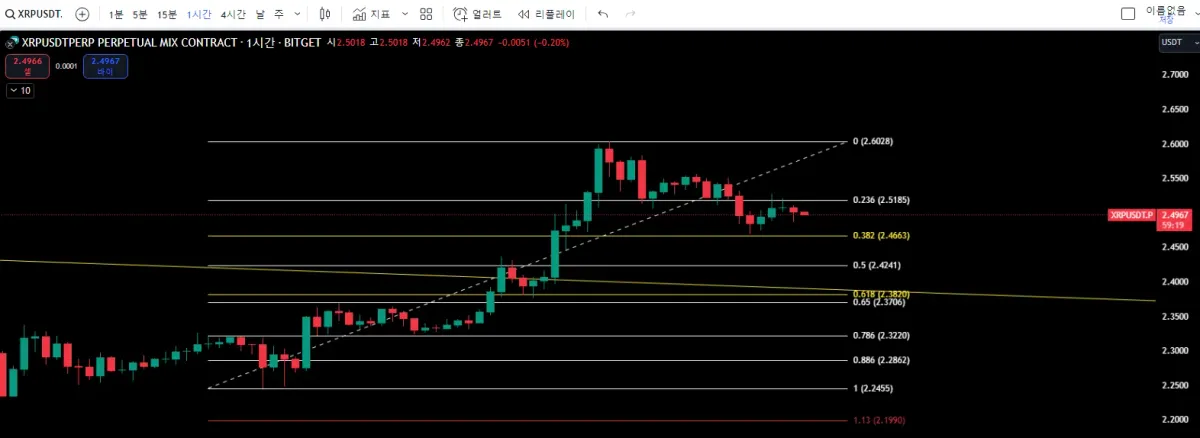 리플이 고점을 찍은 후 피보나치 그려서 지지받을 자리를 기다렸습니다