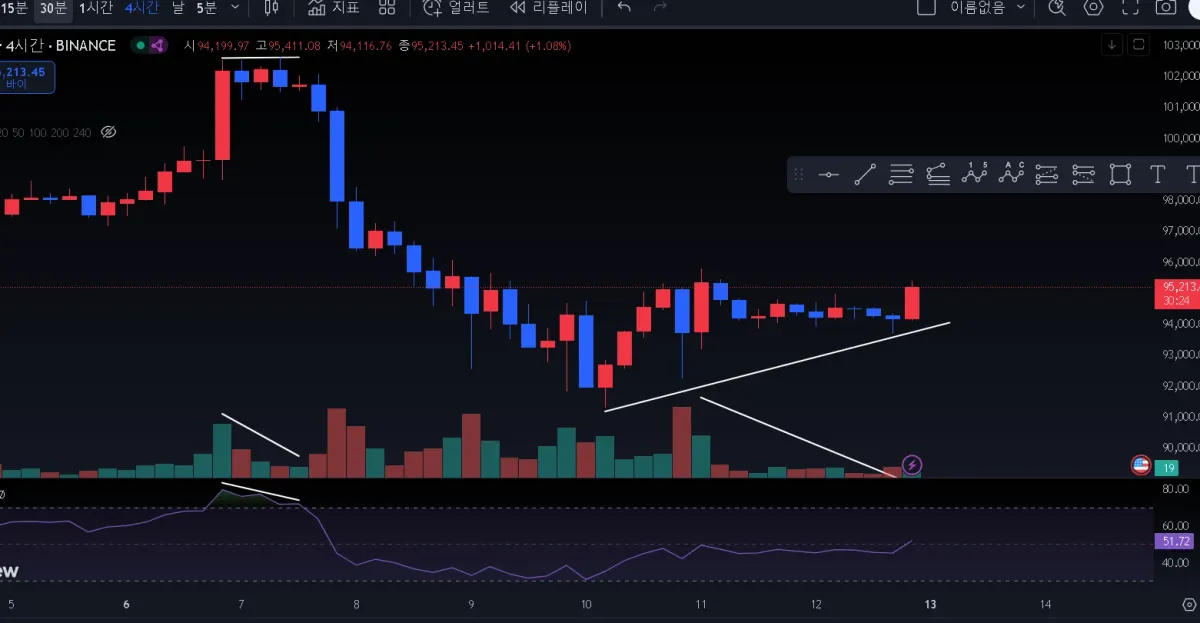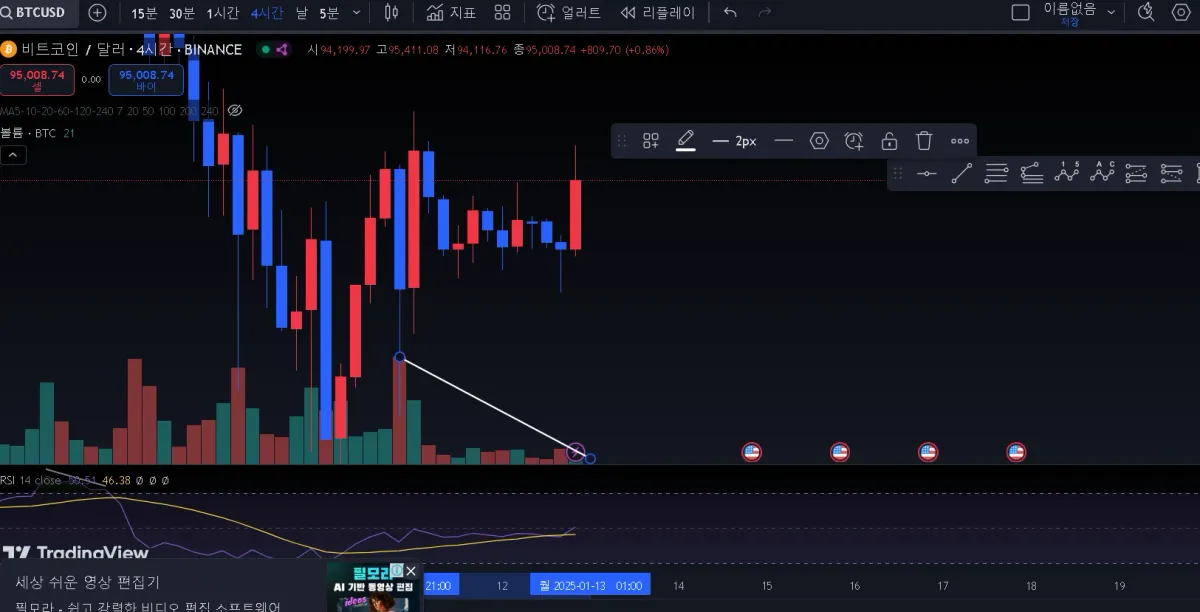 1월 7일경 캔들은 일시적으로 큰변화가 없는 모습에서 RSI는 과매수구간에서 점차 고점이 낮아졌고
