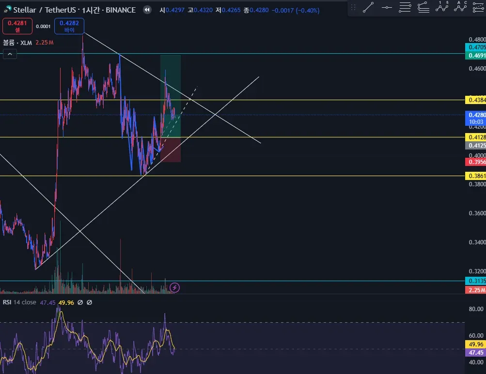 매도예약 걸어둔 줄 알았는데.. 0.4384 노란 저항선에서 매도 계획이였는데 더 지켜보다가 점선 추세선을 뚫고 내려가지 않고 상승한다면 조금 더 기다려 볼 생각입니다..