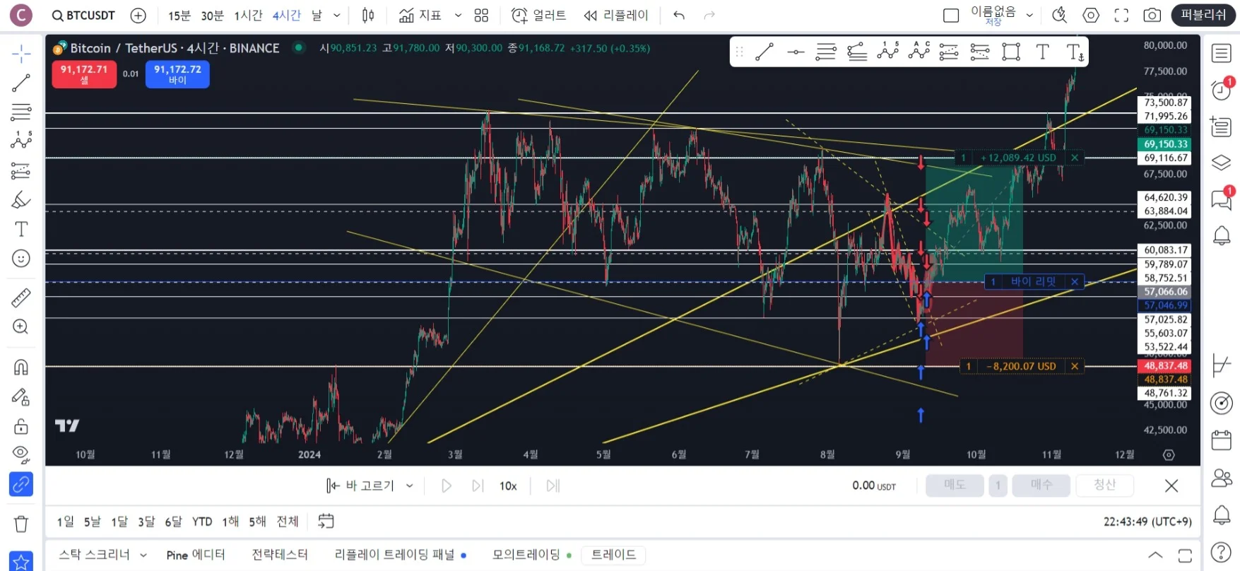 리플레이로 진행을해서 일봉 지지저항선, 추세선, 시장구조변화 / 4시간 지지저항선, 추세선, 시장구조변화 / 1시간 지지저항선, 추세선, 시장구조변화 작성해보았고