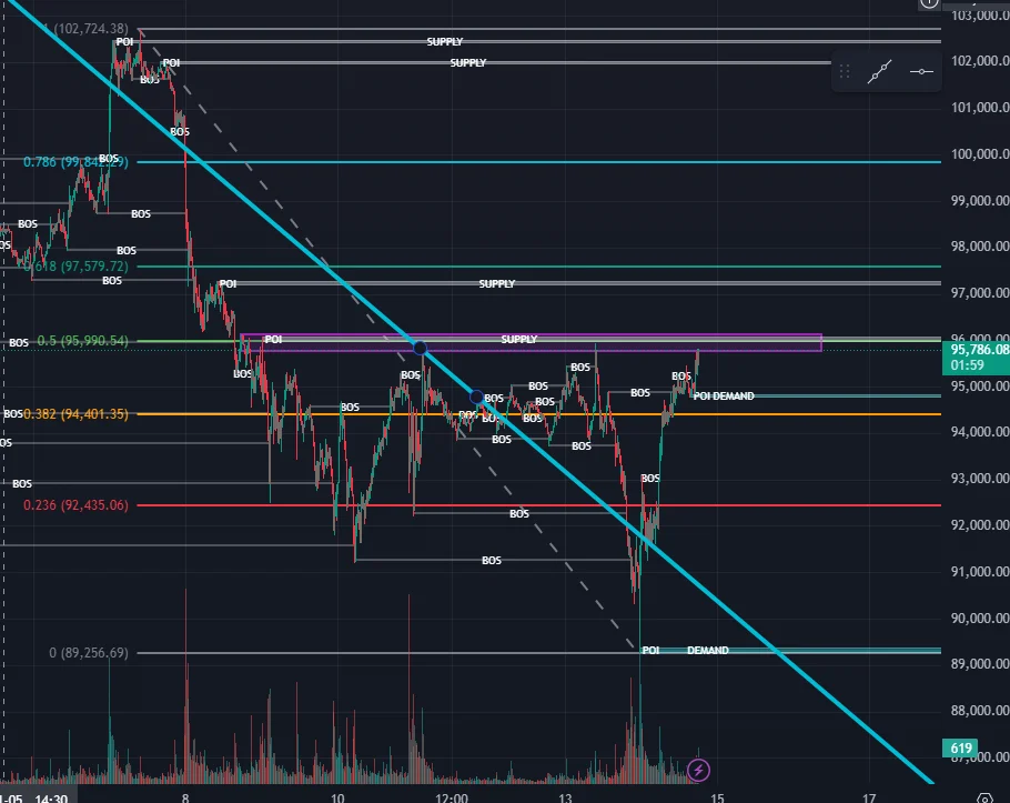 전고점과 전저점을 잇고 0.5 피보나치 되돌림 구간에 저항 리테스트를 여러 번 한 것으로 보아 확실하겠다 싶어서 전 고점인 95,940 라인을 뚫으면 SL 걸었습니다.