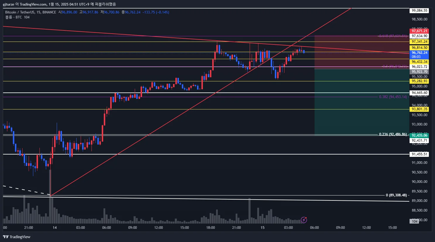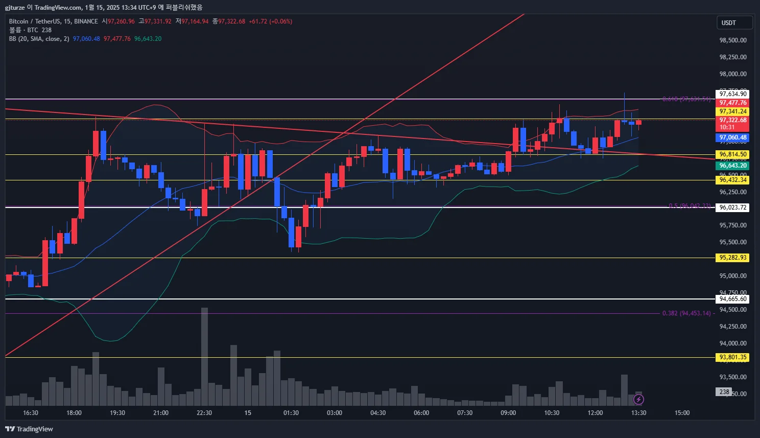 15분봉으로 보면 1월 13일 기준으로 상승추세이긴하나 고점이 하락추세선에 저항을 받고 점차 낮아지는 모습을 보게됬습니다.