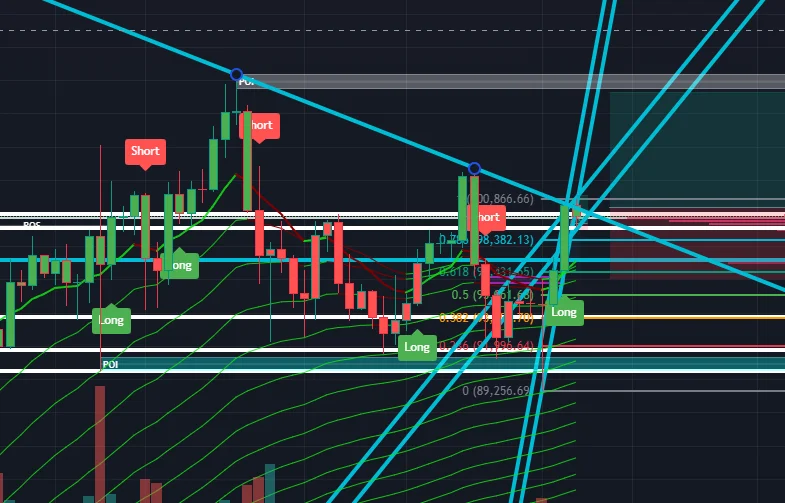 2번 째 매매 99,900에서 숏 포지션 잡고 하단 추세선 닿자마자 익절과 동시에 롱으로 포지션 전환