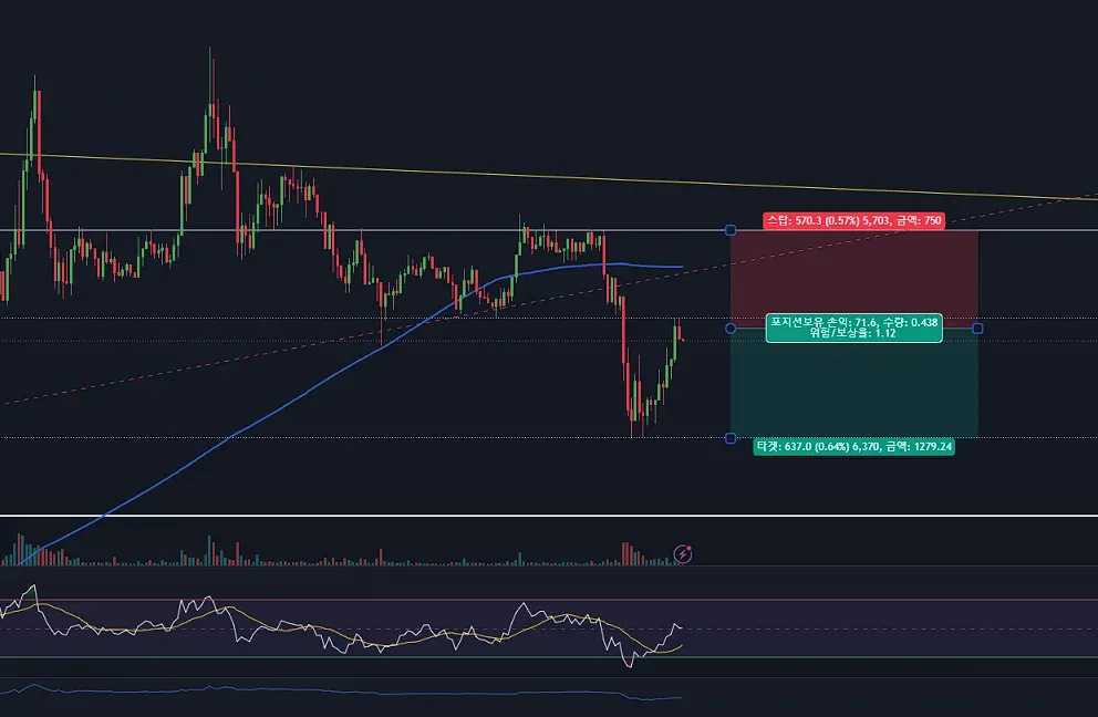 -거래량이 줄면서 같은자리 저항을 두번 터치 후 뚫지못하는거 같아 힘이 빠졌단 느낌이 들어서 하단 얇은 지지선까지 다시 내려올꺼같아 해당자리 단타 매매 중