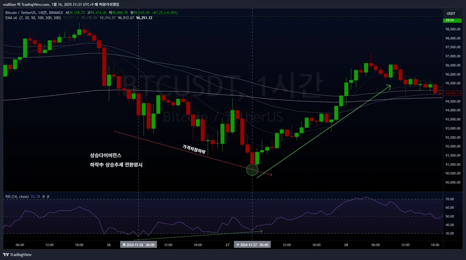 예를들어, 1차적으로 상승다이버전스가 발생하여 매수해도, 하락추세가 이어지는 경우가 있어 손실이 날 수 있을 것 같습니다.