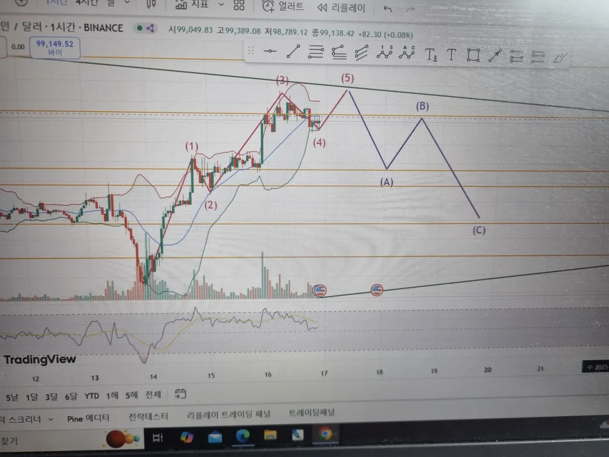 비트 차트상 1시간봉에서 지지와 저항 추세선과 얼리엇파동을 고려했을때 개인적인생각으로 약상승후 저항선에서 하락&삼각수렴이 될거같아서 현위치에서 숏포지션으로 진입하였고 다음주 중에 하단 지지선에 다가오면 익절할려고 스탑로스를 했습니다.