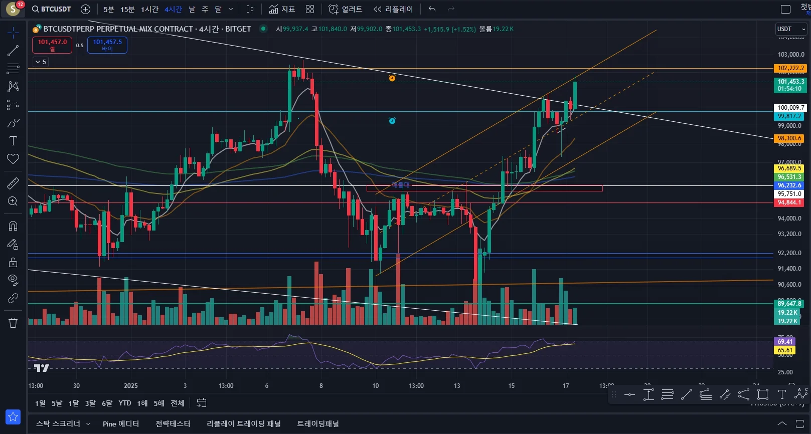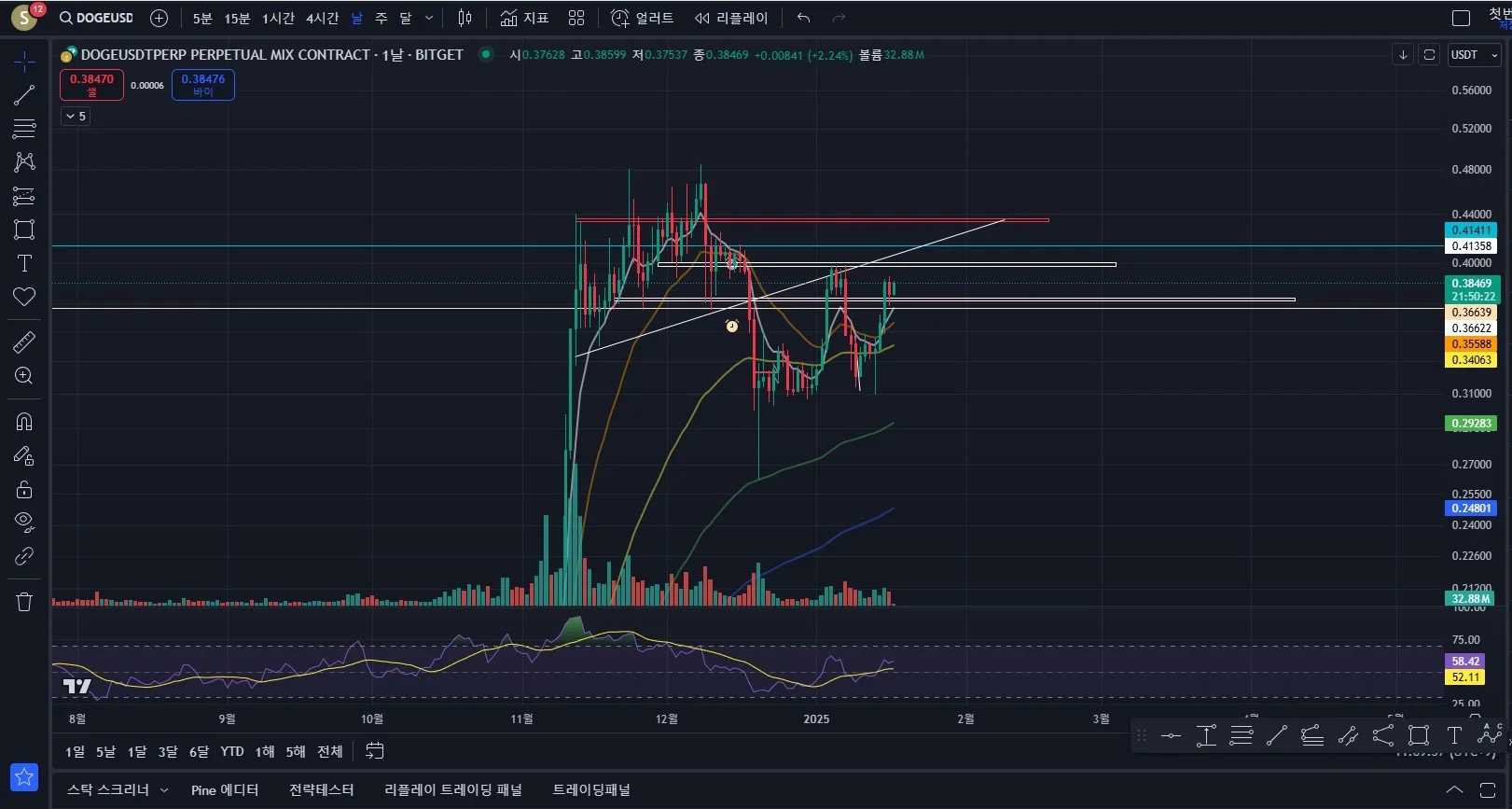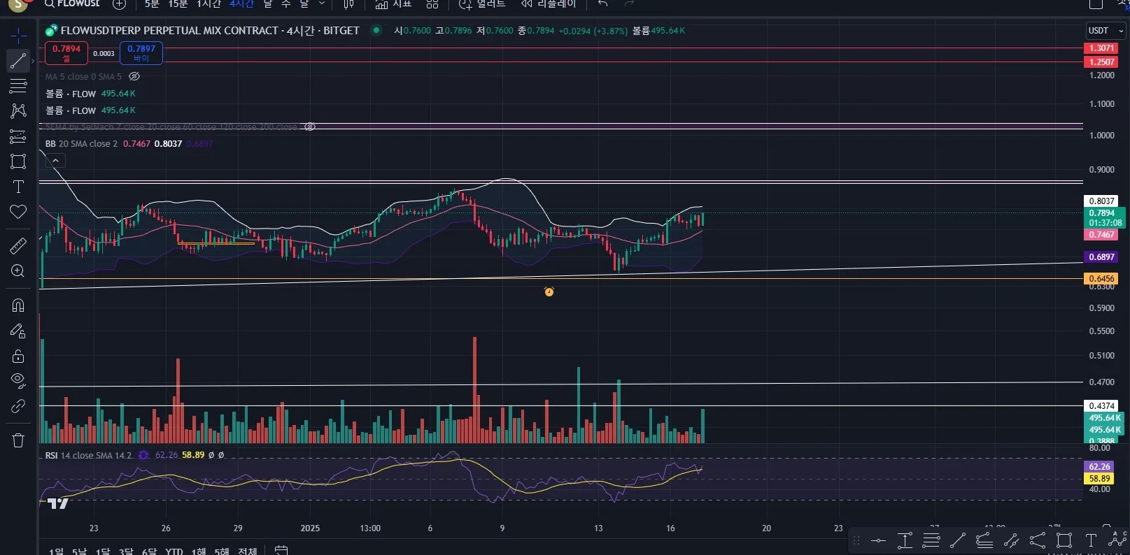추가로, 블린저 밴드로 봤을때 4시간봉, 날봉상 중간선을 지지받는상태로 상승을 보이고있는 상황이고 거래량은4시간봉에서는 상승중입니다.