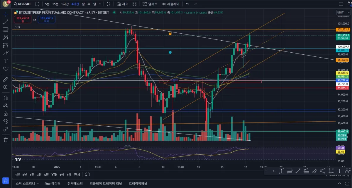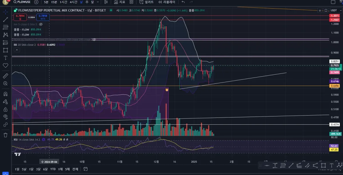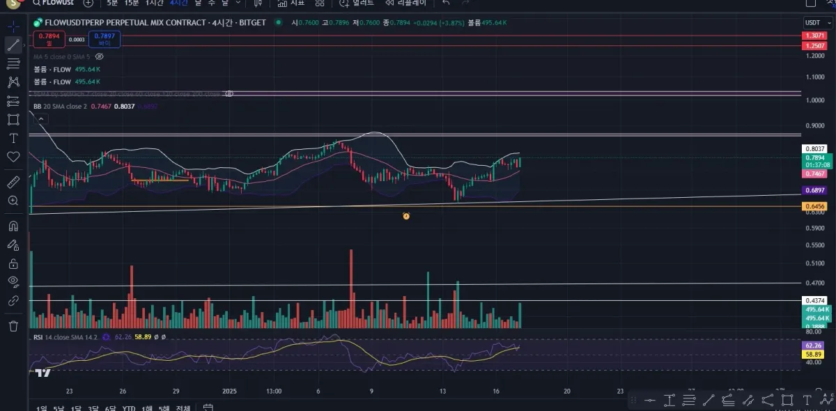 추가로, 블린저 밴드로 봤을때 4시간봉, 날봉상 중간선을 지지받는상태로 상승을 보이고있는 상황이고 거래량은4시간봉에서는 상승중입니다.