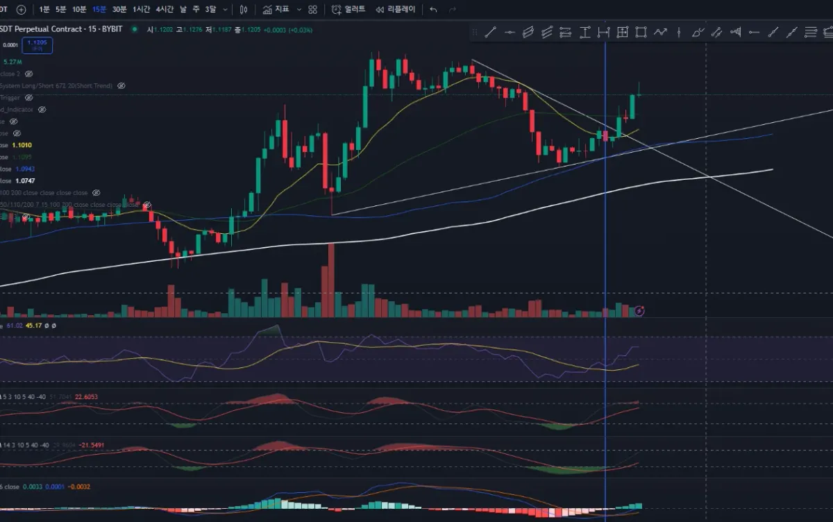 15분봉 상승쐐기형 패턴, 이동평균선 상승의 힘이 강해서 진입했습니다.