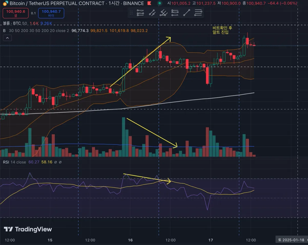 볼밴은 찢지만, 거래량 하락 +rsi 과매수 구간 + 다이버전스 (다이버전스는 30분 봉, 15분 봉으로 보면 더 잘 보임) => 오늘의 포지션은 숏으로 결정