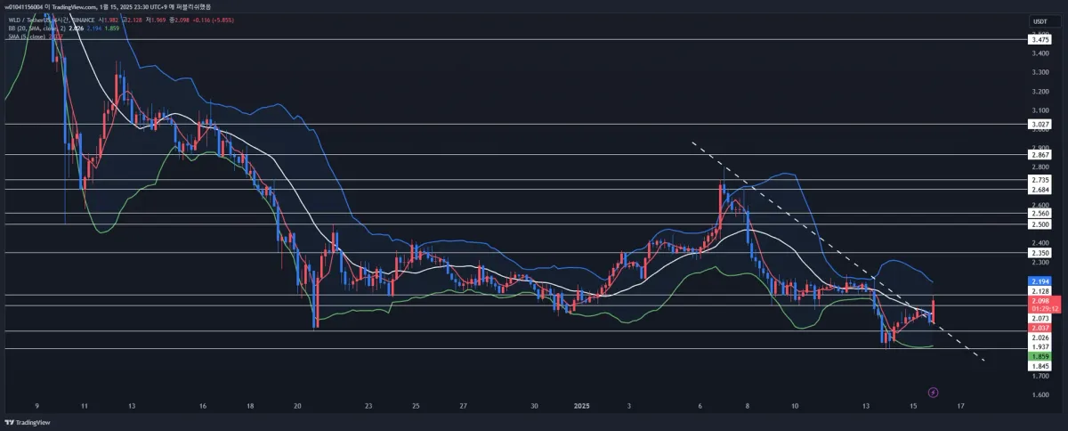 월드코인(WLD)은 빗썸에서 12월에 매수해서 아프게 물려 있는 종목으로 30일 챌린지를 시작하면서부터 비트코인 작도 연습할 때 항상 같이 하던 종목입니다.