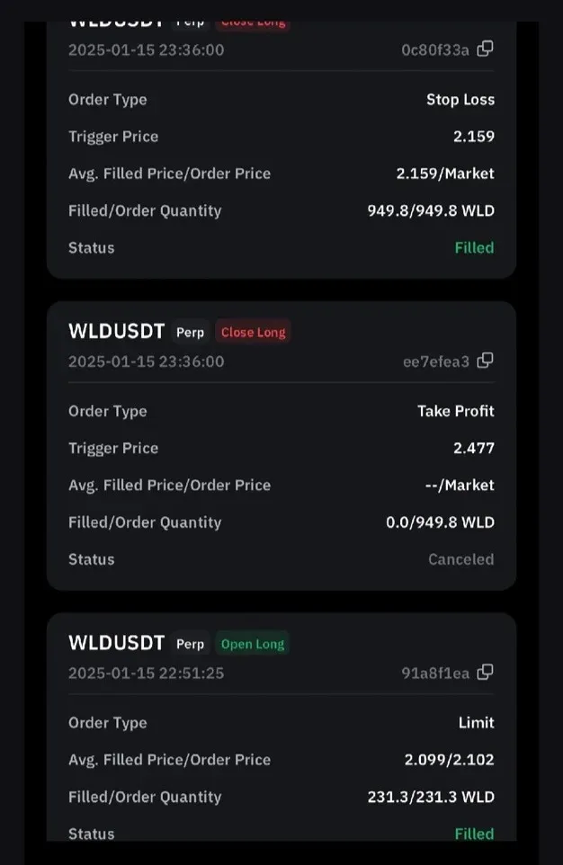 15일 22시 50분경 2.099에 231개의 월드코인을 매수하고 2.477에 지정가 매도를 설정했는데, 중간 비트의 무빙이 불안해서 2.159에 매도하였습니다.