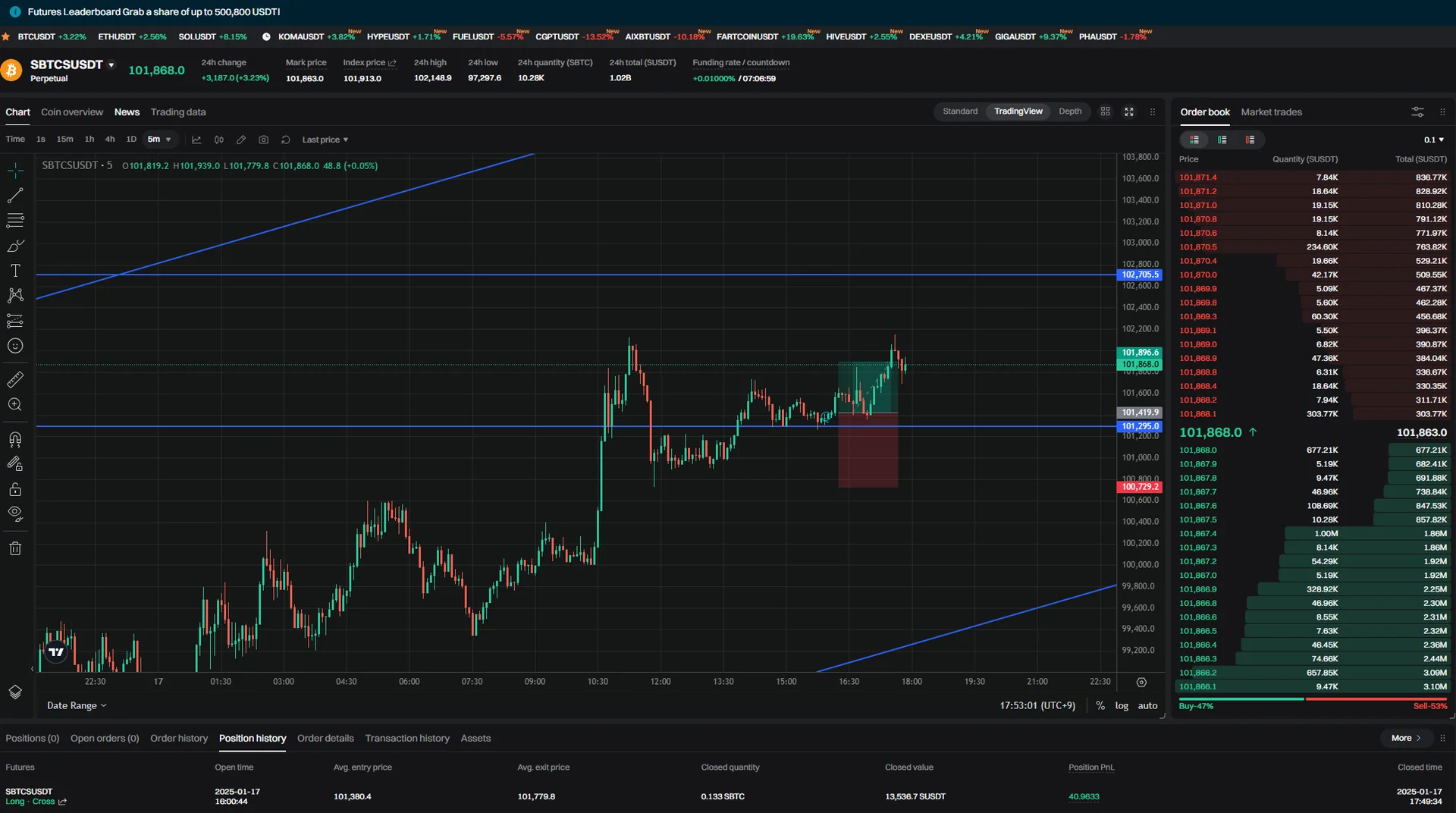1차로 지지선을 지지해주고있어서 매수포지션을 들어갔다 큰 시간봉의 차트를 봤을때도 추세선이 상승추세에 있었고 아래 추세선을 닿고 올라가고있는 상황이였다. 그래서 롱포지션을 들어갔을때 수익과 스탑로스를 정했다. 스탑로스는 5분봉기준 이탈자리가 나왔었던 선에 걸어뒀고 익절선은 큰 시간봉의 저항대에 걸어놨었다. 근데 작은 시간봉의 저항대를 보지못하고 너무 크게 익절권을 잡은거같다. 하지만 그래도 진입 타점을 잘 잡아서 수익으로 마무리했다.