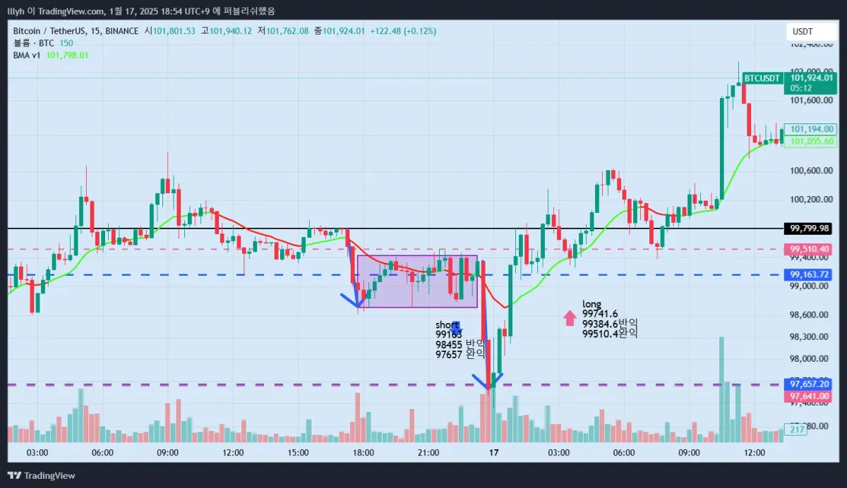 14일과 15일 동안 꽤나 여러번 저항선으로 작용했던 부분이 저항선으로 작용할 수 있을 거 같아 익절 목표가로 선정하였습니다.