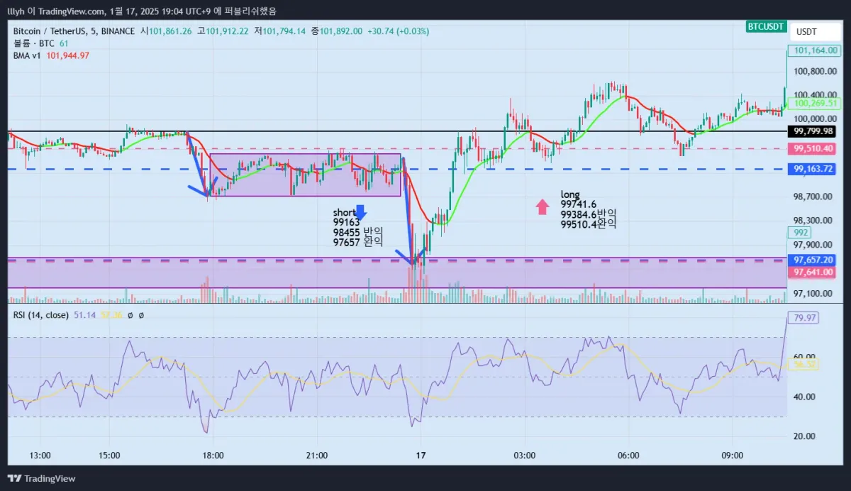더 이상 저항선을 뚫어주지 못하는 모습도 보이고 비트코인의 큰 추세가 상승이기 때문에 롱 포지션으로 전환하였습니다.