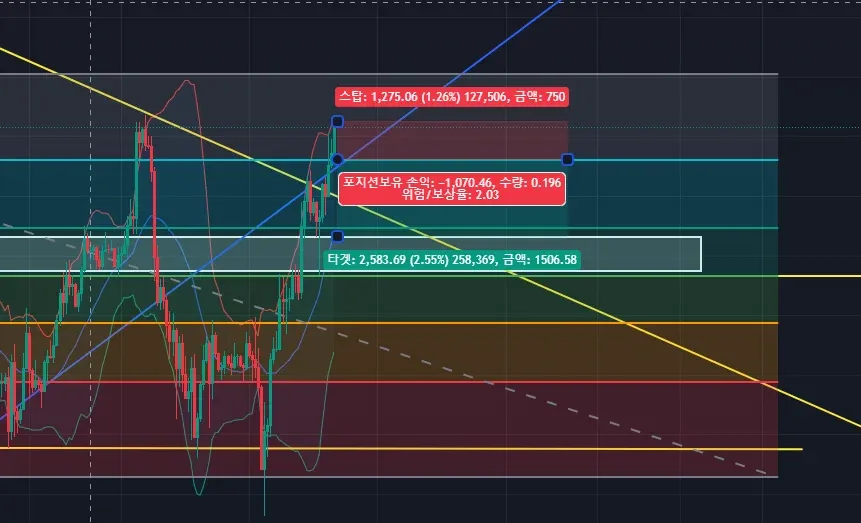 피보나치0.786에 맞고 하락하는 시나리오로 숏 포지션을 진입 했습니다만 계속 상승하여 스탑로스 맞고 손절 하였습니다.