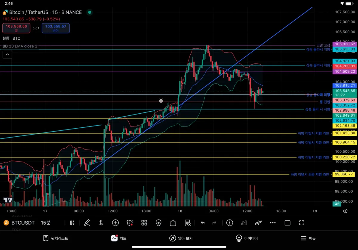 과거에 지지와 저항들을 배경으로 추세선(빗각으로 변경)을 타고 올라가는 상승 추세를 기반으로,