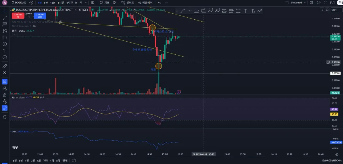 거래량 증가 및 추세선 하향 돌파하는 것을 확인 후, 리테스트구간에 숏진입 하였습니다.