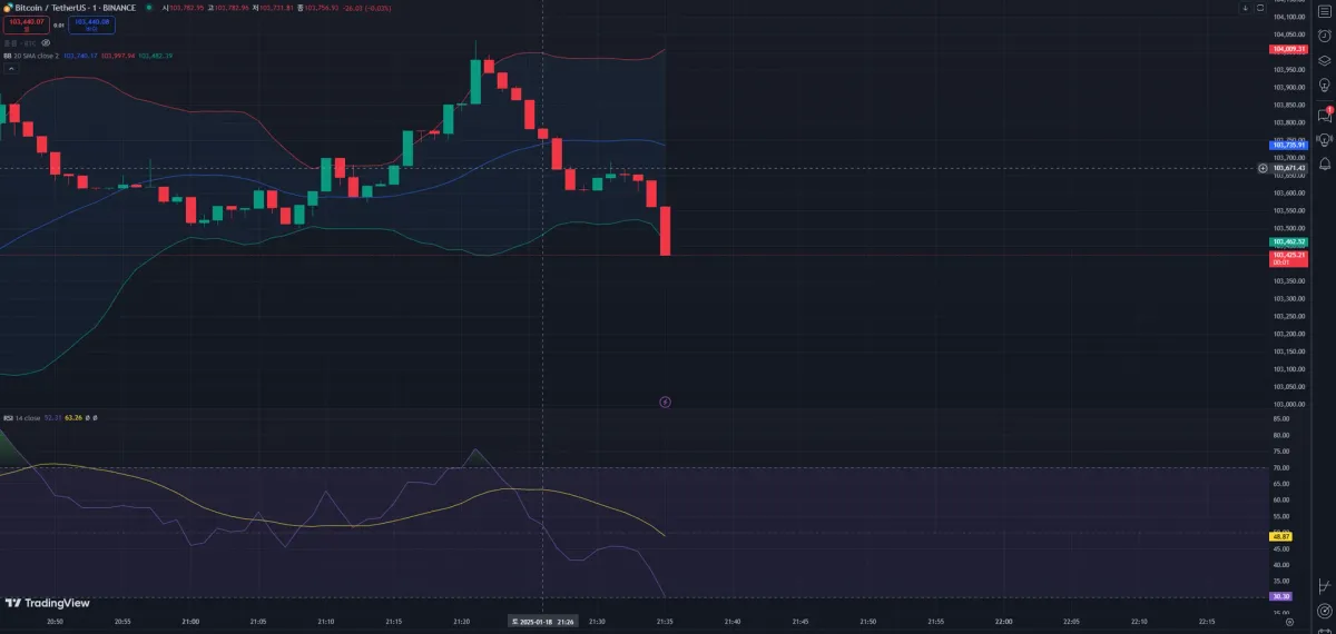 1분봉 볼린저밴드의 하단 이탈하여 롱포지션으로 들어갔습니다.