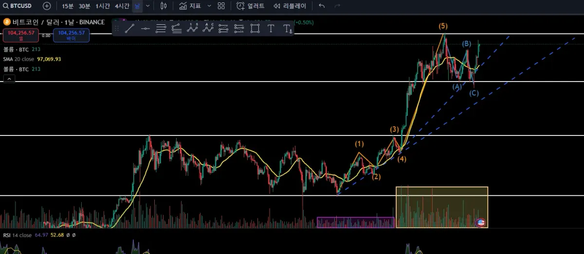 초보라서 잘 모르지만 분석한 내용 적어보겠습니다. 91.6k에서 유의미한 지지하는 모습을 보였다고 생각합니다. 위의 저항선이 되는 107.7k 저항선을 돌파시 신고가 갱신이 가능할 것으로 예상됩니다. 거래량 측면에서 보라색 부분 보다 확연히 거래량이 늘어나면서 가격이 많이 오른것을 확인했습니다. 단기적으로 보았을때 20일 이평선과의 격차가 생겨 단기적으로 하락하거나 횡보할 가능성이 높다고 생각합니다. 열심히 배우겠습니다. 감사합니다.