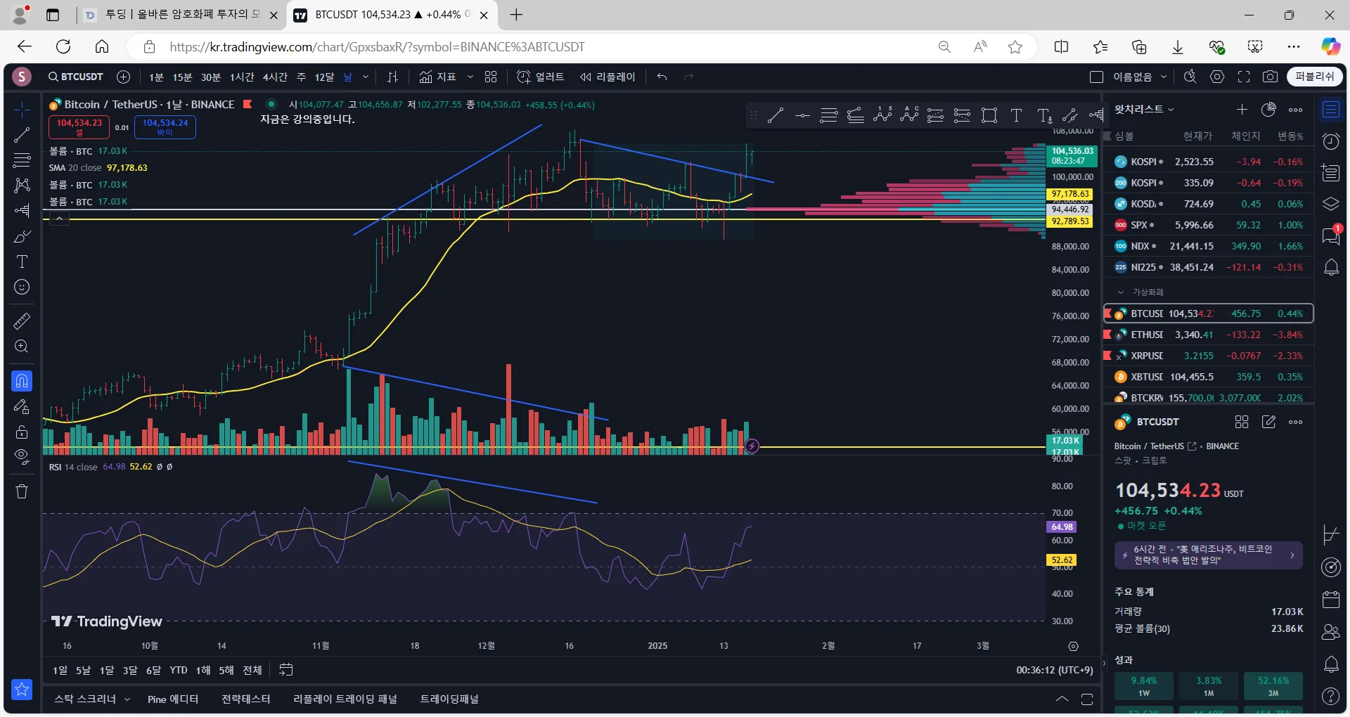 가격이 상승하고있는데, RSI가 감소하고있고, 거래량은 감소중
