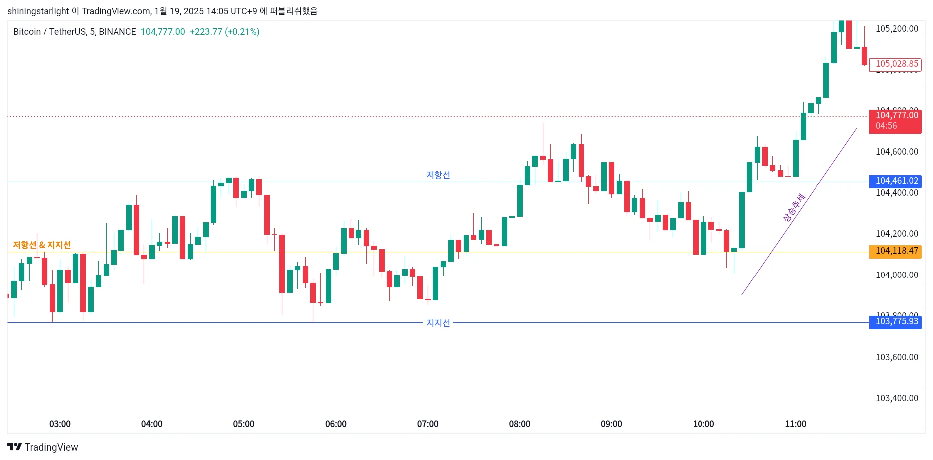 비트코인 5분봉으로 지지선, 저항선, 추세선을