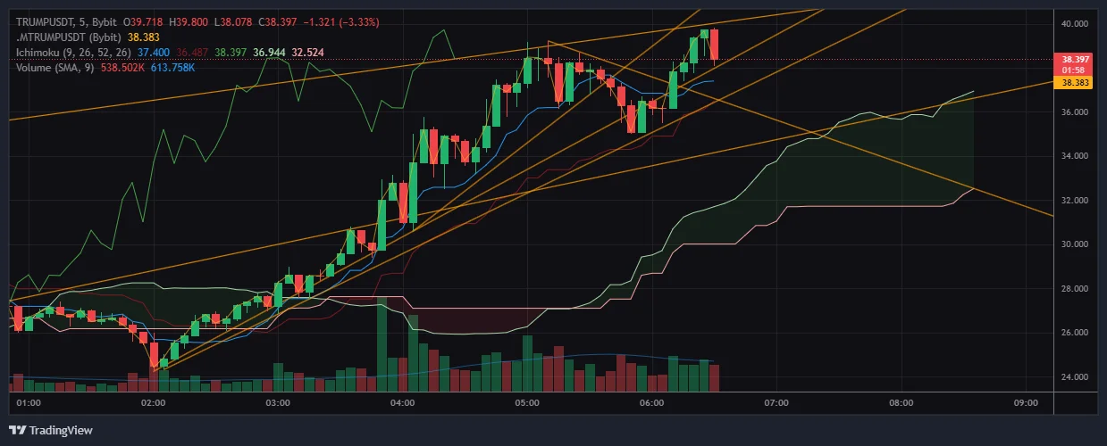 또한 고민 끝에 다른 지표를 전부 제거하고 예전에 잠깐 사용해봤던 일목균형표를 도입하고 5분봉으로 전환했습니다. 예전에 잠시 써봤는데 그간 배운 것과 너무 다르고 복잡한데다 다른 지표(이동평균선 등)과 병행해서 쓰면 알아보기가 어렵고, 타점이 생각만큼 많이 보이질 않아서 꺼뒀었는데, 오히려 초고변동성을 보여주는 트럼프코인의 지금 상황에서는 잘 맞지 않나 생각이 들어 다시 꺼내봤습니다.