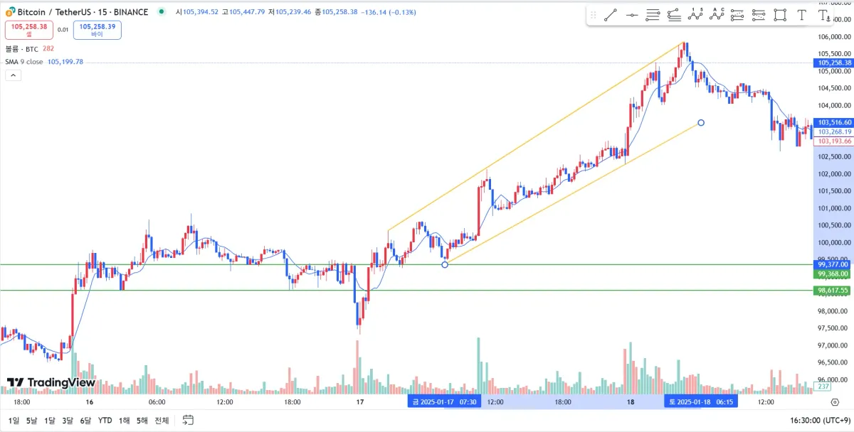 비트코인 1월 16일 15분봉으로 조회해서 추세선과 지지선, 저항선 그려봤습니다.