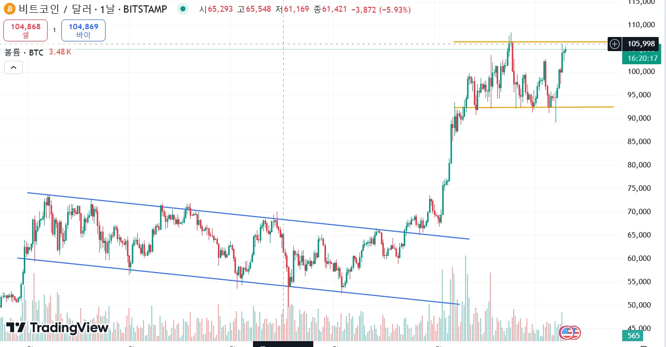 비트코인 일봉입니다 긴 기간동안 채널내 지지 및 저항에 따라 움직였습니다 채널 상단 저항 돌파 및 지지 리테스트 후 큰 상승 일어났으며 현재 박스권에서 움직이고 있는 것으로 보입니다