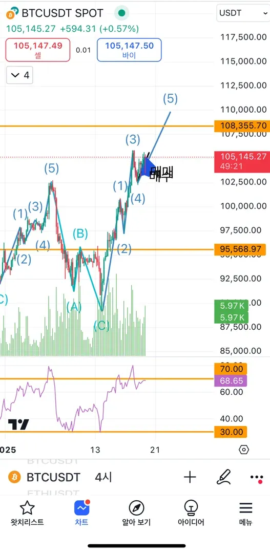 엘리어트파동을 이용하여 5파라고 확신이 들어 저점을 높이면서 상승하고 있어 저점에서 매수 후 매도하였습니다 원래 더 들고 가는것이 맞다고 판단하지만 3파가 짧아 5파 길이가 예상되지않고 아직 연습이 부족한 상태라 매도 후 움직임을 보려고 합니다