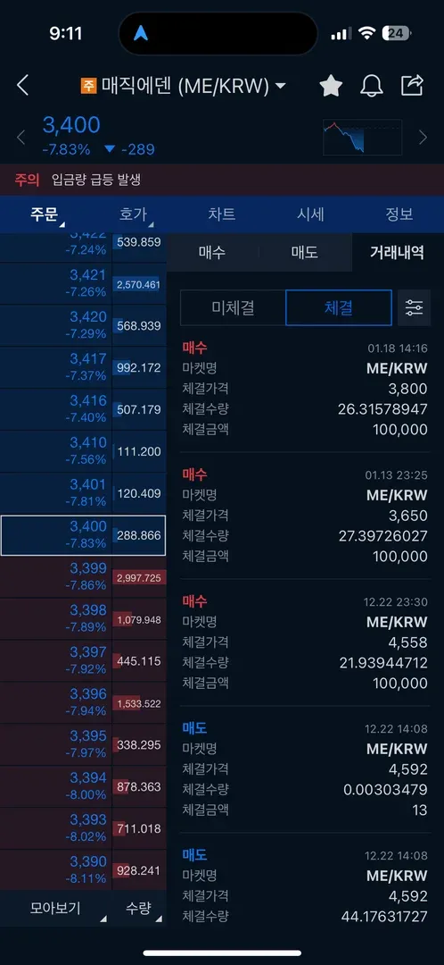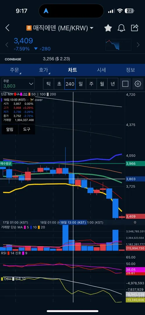 매직에덴을 원래 보유중이였는데 투딩에서 배운 지식을 토대로 물타기를 진행해보았습니다. 18일 오전 급등을 보였고 240분봉 기준으로 볼린저밴드 상단을 뚫길래 하락을 기대하고 3800선에서 추가매수를 진행했습니다. 그런데 지금은 더 하락하여 -14퍼센트가 되었습니다..ㅎㅎ 지지선도 그어보고 나름 판단하여 물타기 하였는데 역시.. 너무 어렵네요 ㅠㅠ