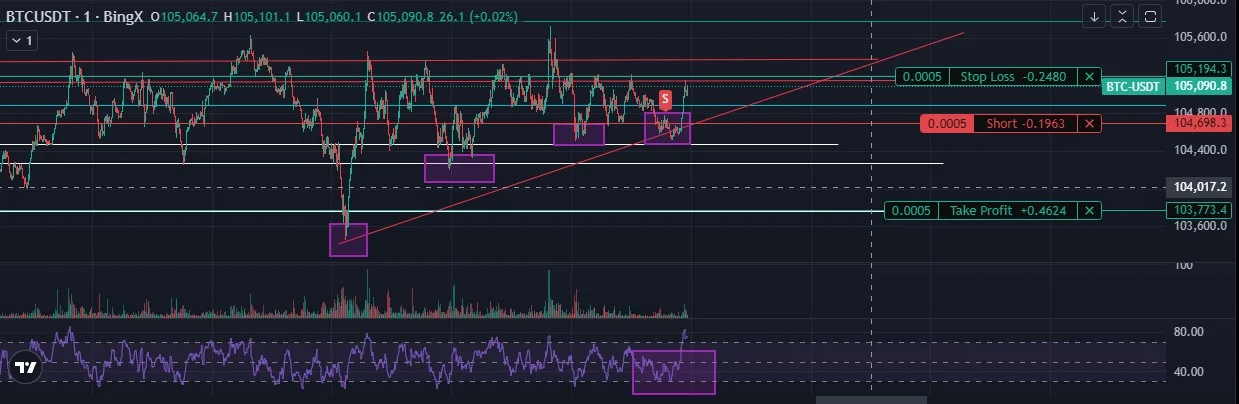 지지선 3터치가 일어났음에도 패턴만 보고 들어가는 뇌동매매를 저지름. 시간이 지나 RSI확인해보니 과매수 구간 터치함.