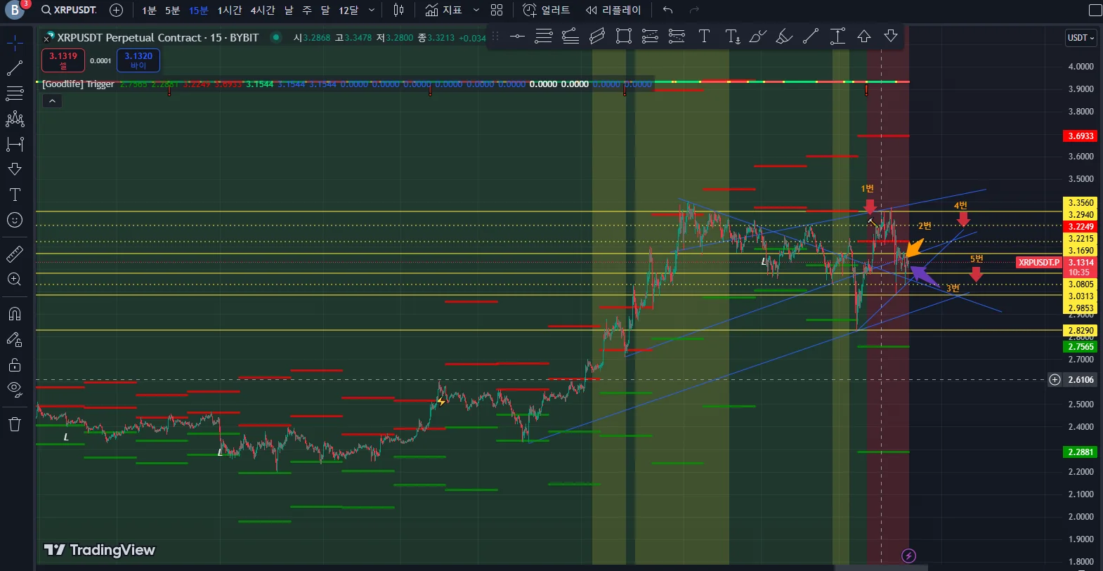 5번 빨간색 화살표 지지선에도 지지를 받은 상황임이 확인되어 진입(3.1510 usdt) 함.