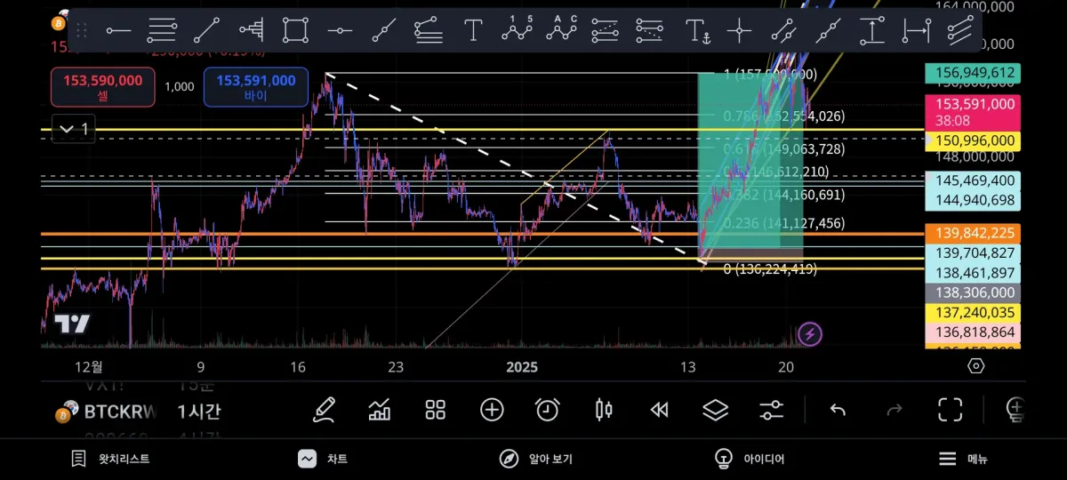피보나치 0.786 지나서 152,700,000과 155,000,000 158,500,000부분익절