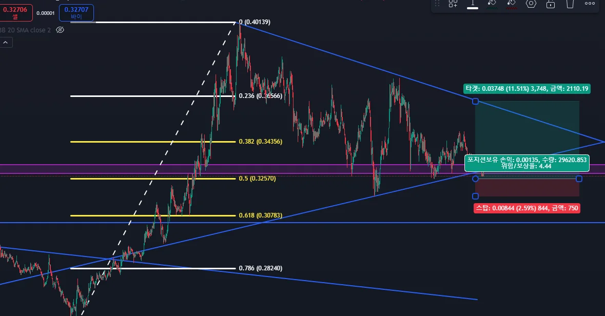 피보나치 되돌림으로 0.5 에서 지지를 받을것 같다 생각들어서 손절라인 짧게 이전저점 0.317로 잡고 진입해보았습니다.