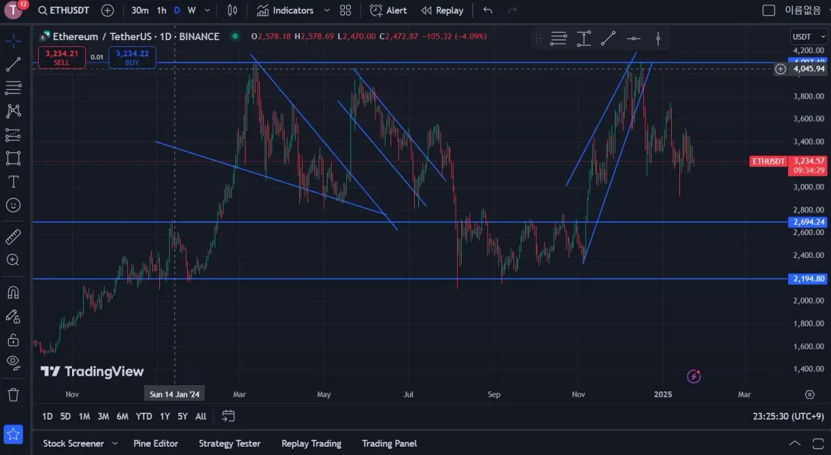 강의에서 배운 지지선과 추세선을 투자하고 있는 이더리움 차트에 대입해보며 복습을 하였습니다. 이더리움은 2,700달러를 돌파한 후 약 4,000달러부근 까지 상승하며