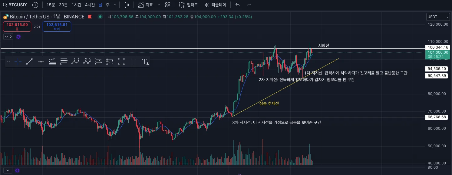 현재 상승 추세선이고 저항선은 106K 구간에서 그려졌습니다.