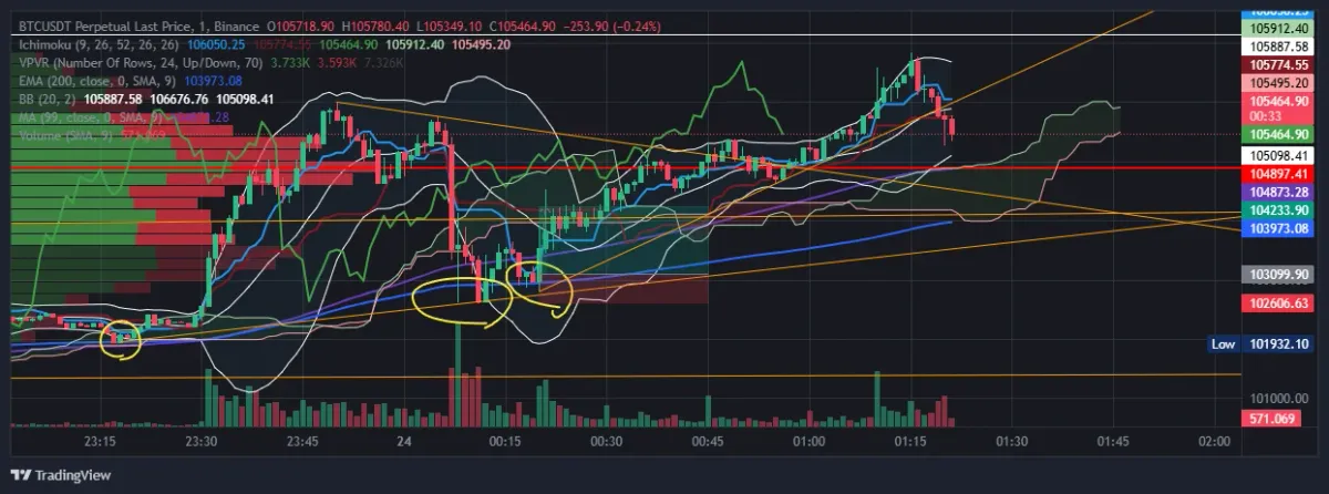 4시간봉 볼밴 상단을 뚫을지 아닐지는 알 수 없어서 그쯤에서 정리할까 생각했습니다. 그런데 살짝 높게 잡아놔서 그런지 1분봉 상에서 제가 그어둔 선을 닿지 못하고 내려가는 모습을 보이더군요.
