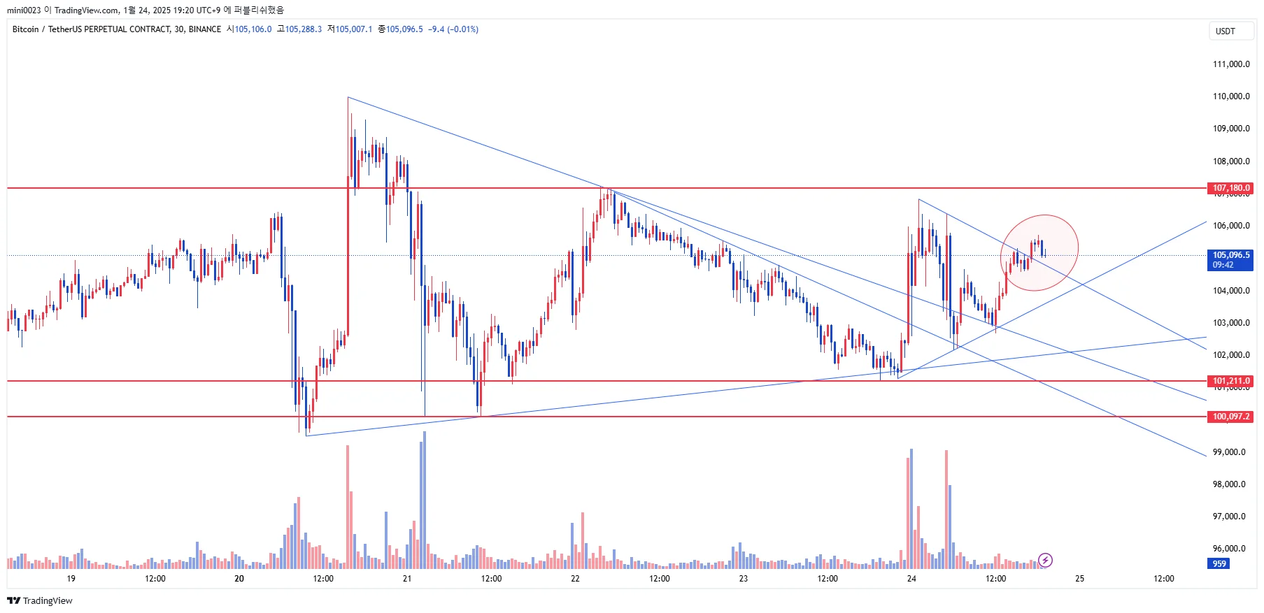 비트코인 지지, 저항 및 추세선 작도입니다. 동그라미 부분 삼각수렴 상방 돌파 후 리테스트 중으로 보이며 리테스트시 매수 가능해 보이네요~~