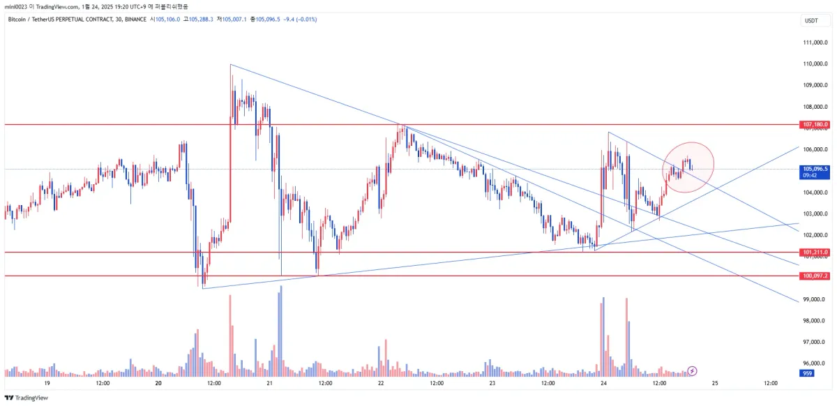 비트코인 지지, 저항 및 추세선 작도입니다. 동그라미 부분 삼각수렴 상방 돌파 후 리테스트 중으로 보이며 리테스트시 매수 가능해 보이네요~~