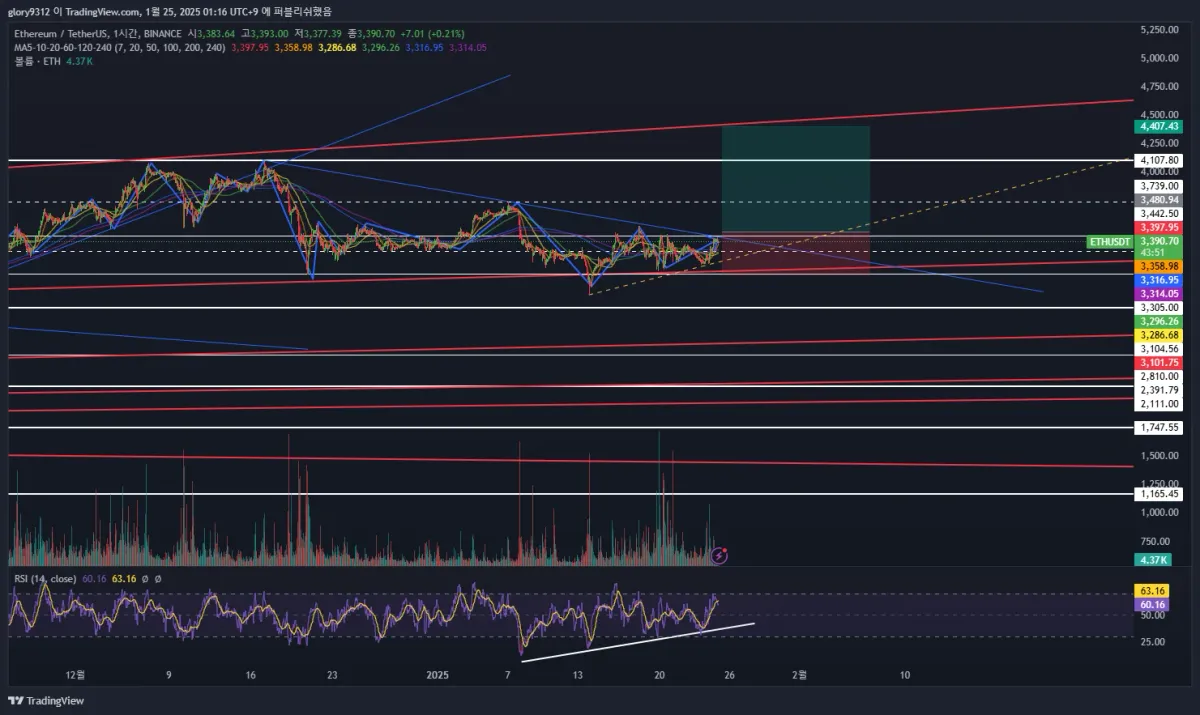 - 최종으로는 제일 상단 빨간색 상승추세라인을 상향돌파하거나 맞고 떨어지거나 둘중하나가 될 것이라고 판단하여 최종 익절라인으로 판단