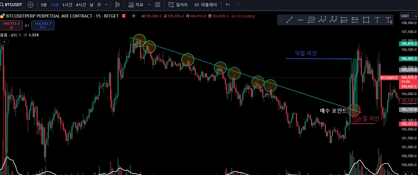 하락 추세선을 상방 돌파한 이후에 리테스트후 상승이 예상 되어 하락 추세선으로 리테스트 하는 부분에서 매수 포지션을 잡고,