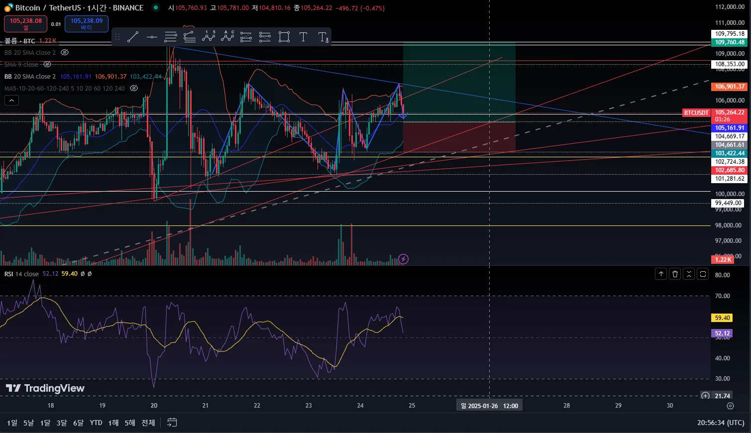 1시간봉에서 보이는 1차지지선 돌파시 2차지지선을 손절라인으로 잡았습니다.