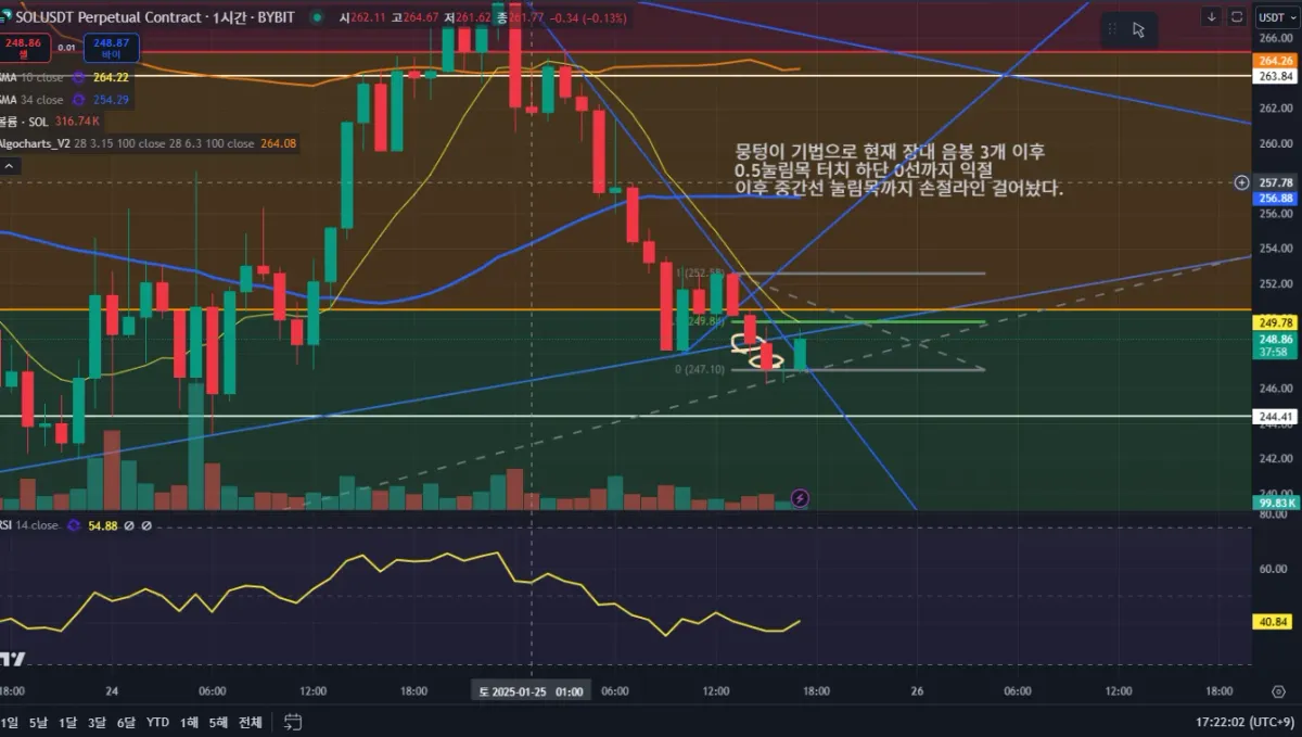 뭉텅이 갠들 발견, 이후에 하락 추세선 돌파 이후 눌림목 발생 하락 진입하지만 추세를 시작했던 곳에서의 강력한 지지선이 주변에 있어서 장기적 숏보단 244.1 라인까지 익절 후 청산한다.