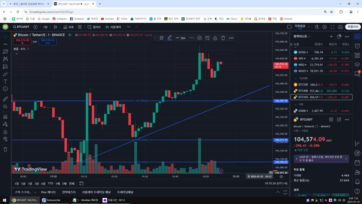 7일 챌린지[30일 챌린지 12기 1주차] 비트코인 1시간봉 지지선과 추세선 작도