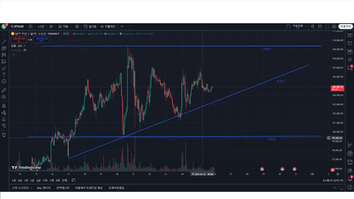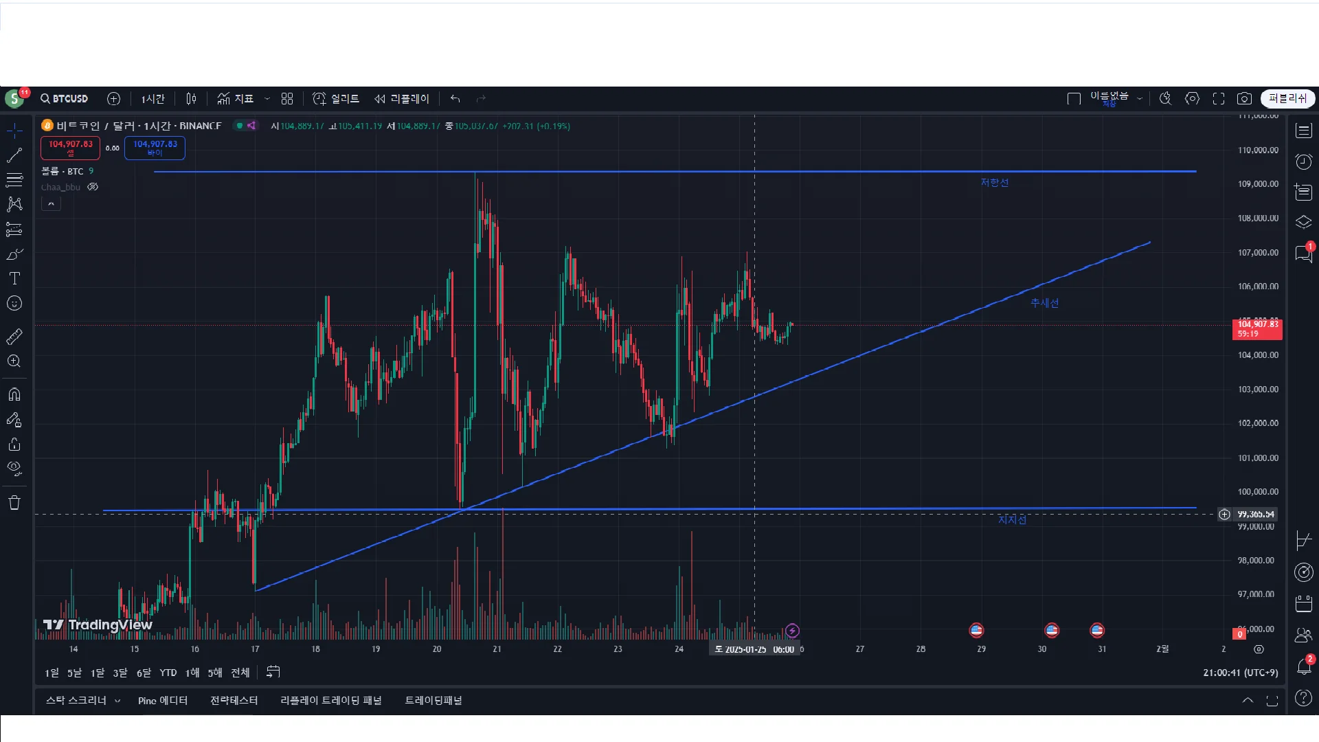 아직 잘모르지만 1시간봉으로 봤을때 삼각수렴??형태가 나올거같습니다