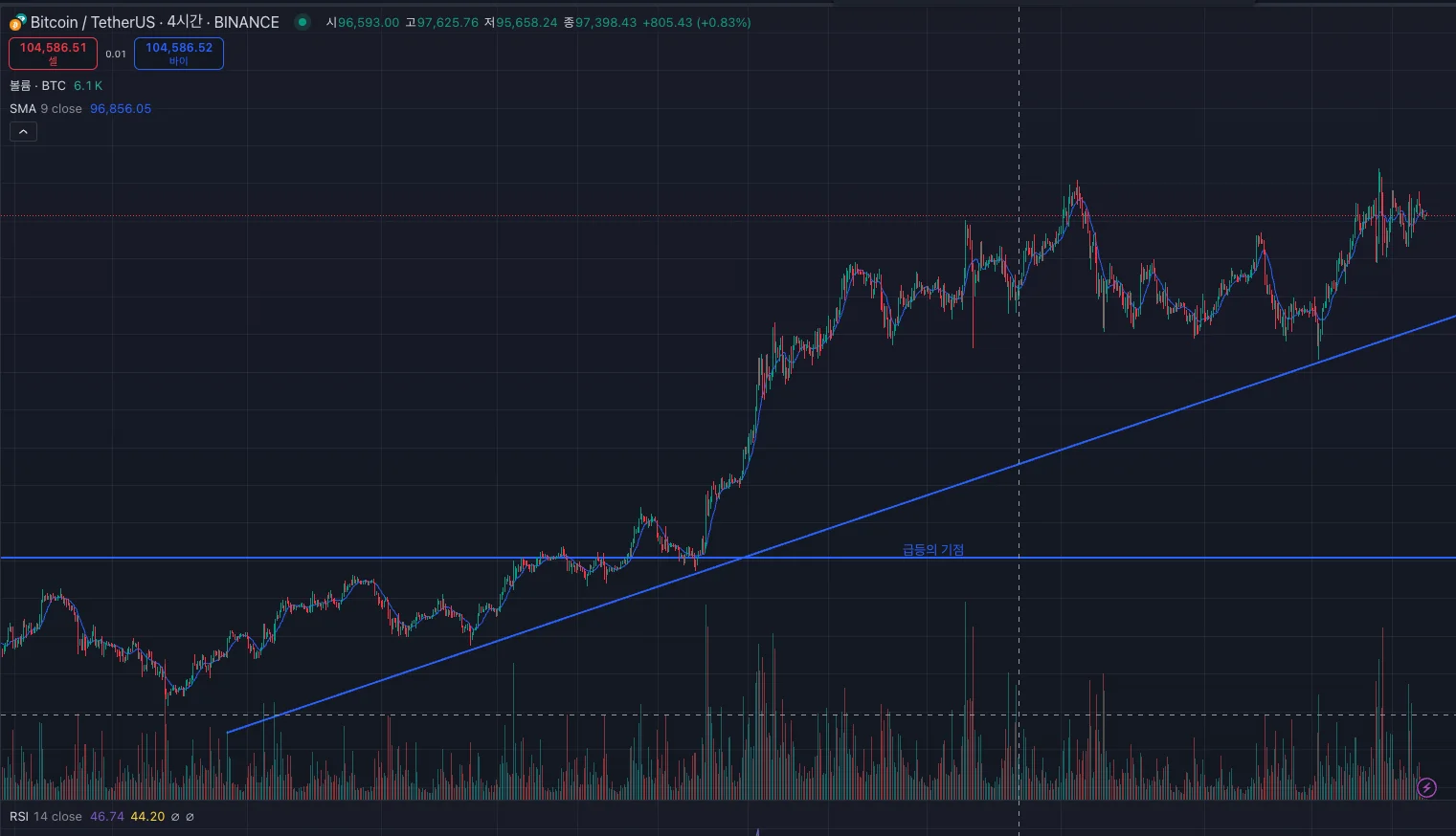 급등의 기점을 기준으로 지지선을 작도했고, 하락하다가 반등하는 두 부분을 기준으로 추세선을 작도했습니다. 해당 상승 추세선에 추가적인 터치가 발생했기 때문에 신뢰도는 높다고 생각됩니다.