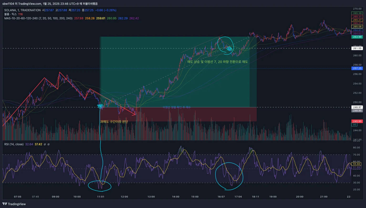 헤드엔 숄더 패턴을 보여 지켜보던중 RSI 과매도가 보여 매수 를 들어갔습니다. 과 매수 구간에서 조금 횡보 하고 매도로 방향이 진행되며, 이평선도 이탈하려는 모습이 보여 익절 진행 하였습니다.