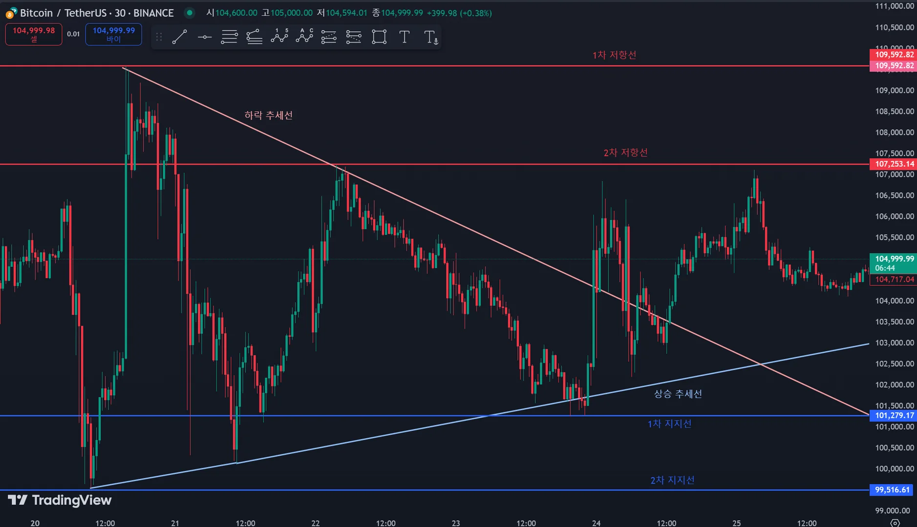 1차 지지선 : 가장 최근의 V자 반등이 일어난 곳