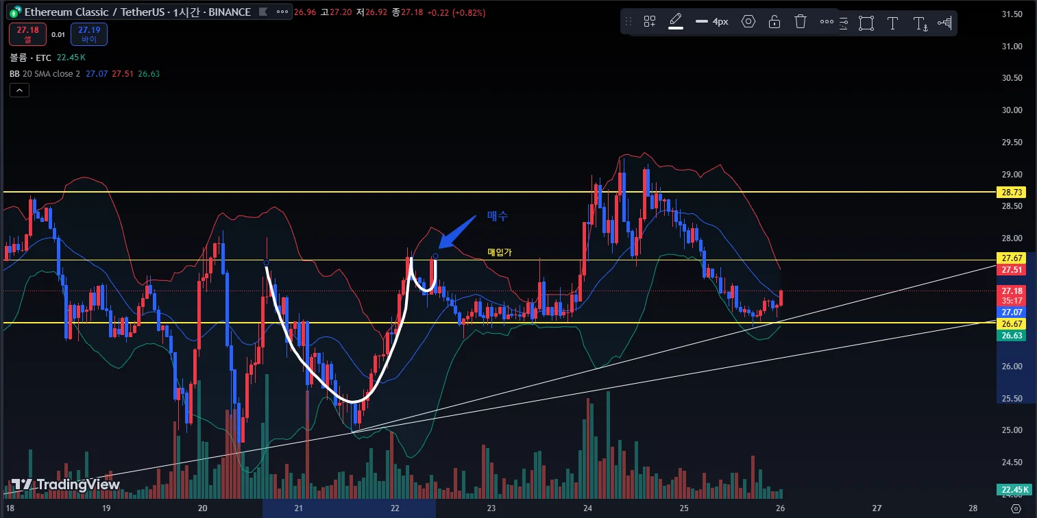 26.67 지지선에서 여러번 지지를 받는 것을 보고 다시 상승할 것이라 생각하고 상승하길 기다렸다.